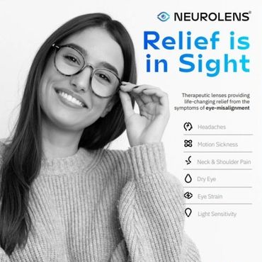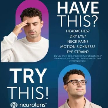 Do you suffer from headaches, neck pain, motion sickness/dizziness, dry eye, eye strain or light sensitivity? Come see us for a free screening with the latest technology to determine if your symptoms can be treated with Neurolens!